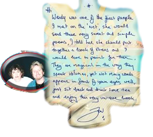 ![]() ![]() "... these very sweet and simple poems .... are magical in the way they speak volumes, yet not many words appear in front of your eyes". Wendy Vig met Jon Anderson, legendary lead singer of rock supergroup YES, while on America Online... |